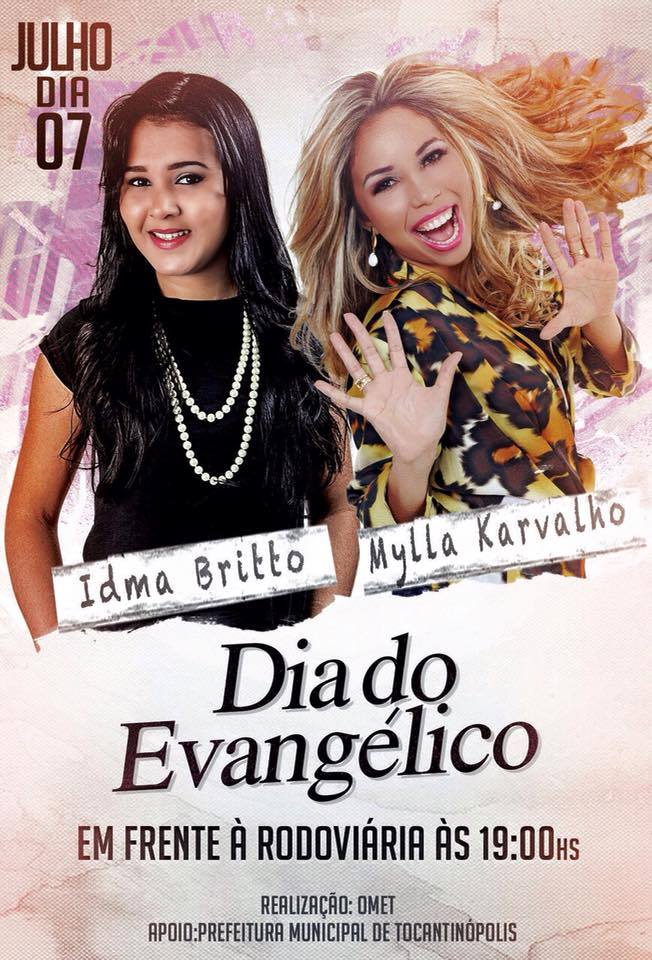 As cantoras Mylla Karvalho, ex-vocalista da Cia do Calypso e Idma Brito serão a principal atração da programação do Dia do Evangélico em Tocantinópolis, na terça-feira (7). O show, promovido pela Ordem dos Ministros do Evangelho de Tocantinópolis-TO (OMET), terá apoio da Prefeitura, Câmara Municipal de Vereadores e igrejas evangélicas do município. O feriado municipal em comemoração ao Dia do Evangélico faz parte do calendário oficial do município desde 2005, conforme Lei Municipal nº 754.