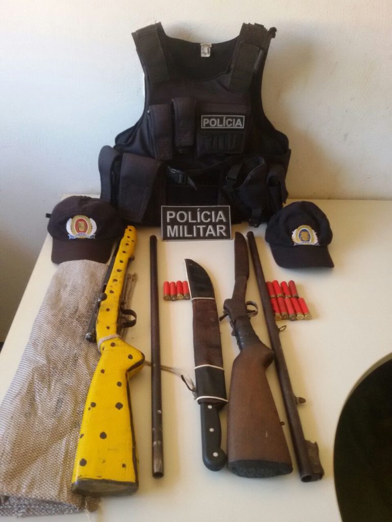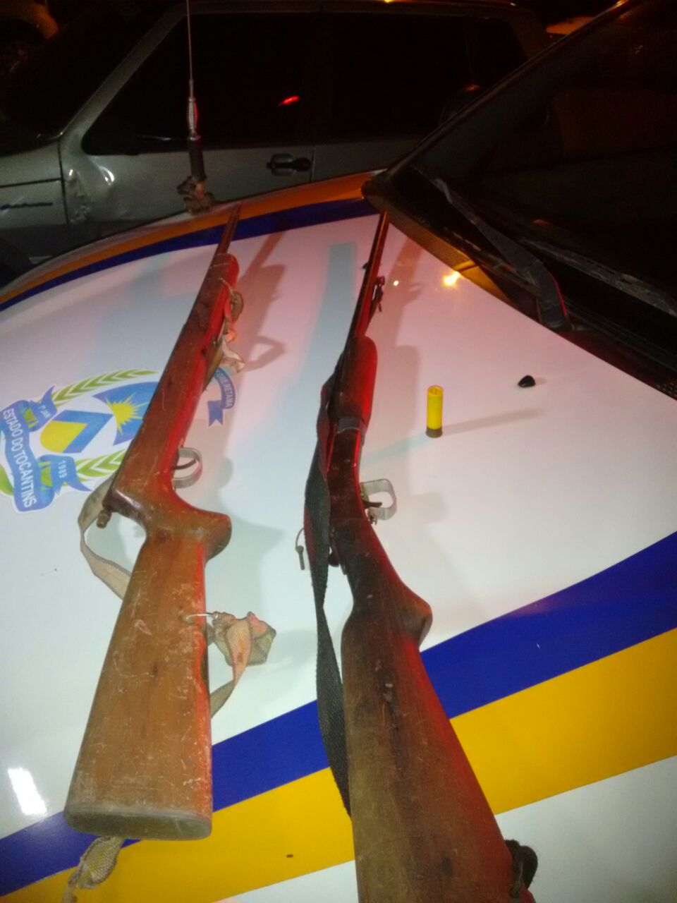 Já em Muricilândia, ainda no sábado, os policiais militares apreenderam duas armas de fogo, que segundo testemunhas estavam na posse de um adolescente conhecido na região pela prática de crimes. O menor fugiu ao ser denunciado deixando para trás as armas, uma cartucheira calibre 20, com uma munição na câmara e outra arma de fabricação caseira, tipo “bate-bucha”. Os objetos apreendidos foram apresentados à Autoridade Policial para os trâmites legais previstos.