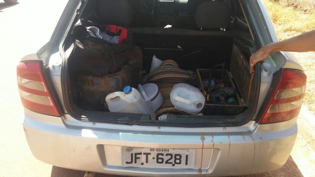 A PM apreendeu também o veículo conduzido por um dos envolvidos, automóvel GM/Astra HB, de cor prata, placa de Goiânia/GO. No interior do carros os policiais localizaram vários objetos: celulares, cela, cabresto, galões de combustível, bolsa com roupas, garrafa térmica, marmitas, duas maquinas de passar cartões de credito e debito, caixa de ferramentas contendo segueta, furadeira, alicates diversos, e chaves diversas.