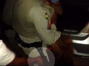 No vídeo, os policiais aparecem tentando prender um homem de camiseta azul listrada. Uma mulher tenta impedir a ação, gritando e agarrando o policial, dificultando o trabalho dos militares.