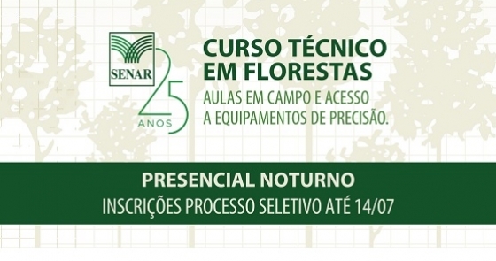Para atender a uma demanda de estudantes da região, o Serviço Nacional de Aprendizagem Rural (SENAR) vai oferecer vagas no período noturno no novo processo seletivo do Curso Técnico de nível médio em Florestas, realizado no Centro de Formação Técnica de Florestas, em Palmas (TO). As inscrições podem ser feitas a partir desta quarta-feira (5/7) até o dia 14 de julho, no site http://www.senar.org.br/processo-seletivo. Serão oferecidas 40 vagas para ingresso no segundo semestre de 2017.