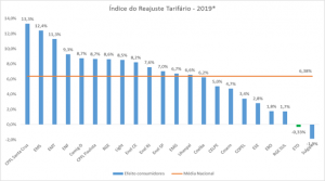 Nacionalmente, a média de reajuste aprovado pela Aneel até 2 de julho tem sido de 6,38%, como demonstra o gráfico abaixo.