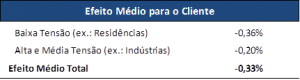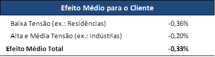 Os clientes tocantinenses perceberão uma redução média de -0,33%. Para os clientes residenciais (baixa tensão) a redução será de 0,36%. Já para os clientes de alta e média tensão, a exemplo das indústrias, a redução será de 0,20%.