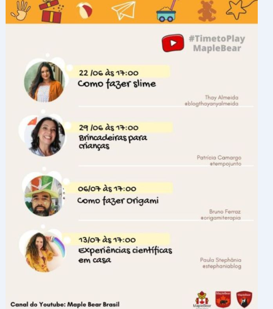Enquanto avançam as discussões em relação ao retorno às aulas presenciais em todo o País, já está claro que teremos mais algumas semanas de distanciamento e que, mesmo na volta, as atividades à distância continuarão a ter um papel importante. Pensando nisso, a Maple Bear, rede canadense de ensino bilíngue com 140 unidades no Brasil, irá promover uma série de quatro webinars gratuitos e abertos ao público no Youtube, para ensinar o passo a passo de brincadeiras criativas e atividades lúdico-educativas. O objetivo é complementar as atividades regulares de ensino à distância e incentivar os jovens a manterem o interesse pela aprendizagem de forma independente. As transmissões, com interação ao vivo, irão ocorrer nos dias 29 de junho, 06 e 13 de julho, às 17h ou 17h30, no canal do Youtube da Maple Bear (confira abaixo a grade).