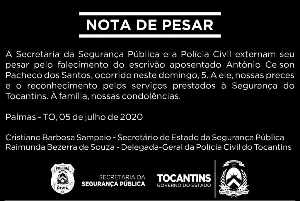 A Secretaria da Segurança Pública e a Polícia Civil externam seu pesar pelo falecimento do escrivão aposentado Antônio Celson Pacheco dos Santos, ocorrido neste domingo, 5. A ele, nossas preces e o reconhecimento pelos serviços prestados à Segurança do Tocantins. À família, nossas condolências.