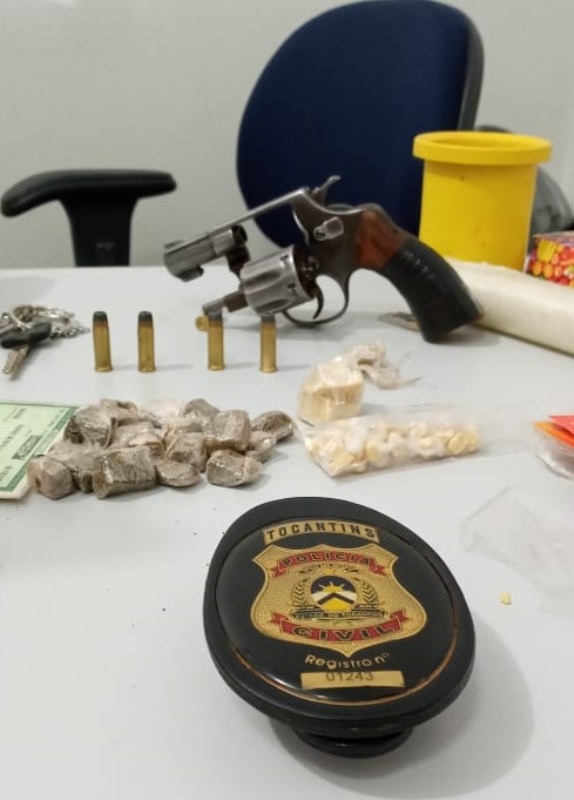 Dentro do imóvel foram localizados 19 tabletes de substância semelhante à maconha; 39 pedras fracionadas de substância semelhante à crack e mais uma porção ainda não fracionada, também de crack ; além de um revólver calibre 32, municiado com 5 munições; uma motocicleta Honda Biz; um aparelho celular e farto material utilizado para embalar drogas.