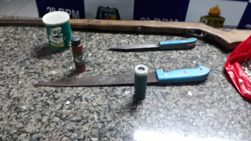 O homem, as armas brancas, a espingarda e a bolsa com projéteis, recipientes com pólvora e chumbo, foram conduzidos à Central de Flagrantes para os procedimentos legais.