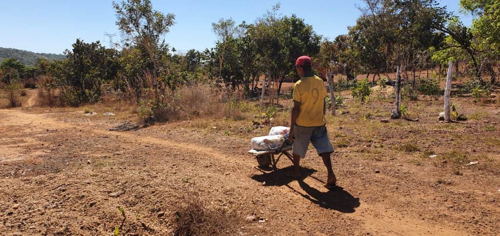 Era por volta de 11 e meia da manhã desta terça-feira, 13, o sol a pino no céu, quando seu Sebastião Pereira, 66 anos, colocou suas duas cestas básicas no carrinho de mão e levou para casa, um barraco pequeno na Comunidade Malhadinha, em Brejinho de Nazaré, onde mora com a esposa, Agna Raimunda dos Santos, que disse não lembrar mais a sua idade, “mas eu ainda sou nova”, frisou. A família que vive em Malhadinha foi uma das 87 contempladas pelo programa do Governo Federal para garantir segurança alimentar e nutricional às comunidades remanescentes de quilombos, por meio da Fundação Cultural Palmares que destinou 7.900 cestas básicas à 47 comunidades quilombolas no Tocantins, distribuídas em diversas etapas, com início de entrega nesta semana pela Secretaria de Estado da Cidadania e Justiça (Seciju).