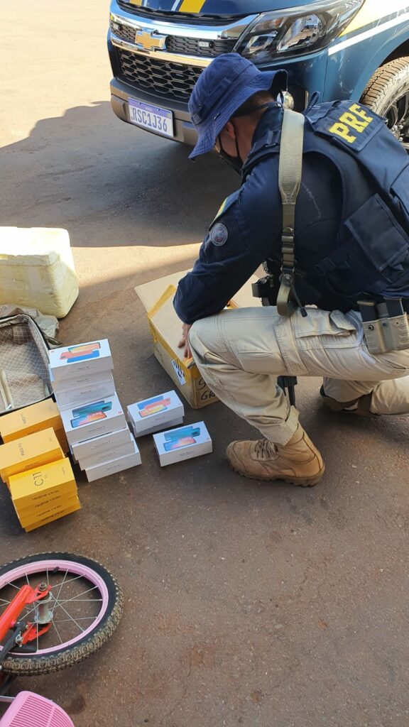Durante a abordagem, os homens demonstraram nervosismo fora do comum. No decorrer da fiscalização a equipe da PRF encontrou uma mala com diversos aparelhos celulares e uma sacola com capinhas de celulares e outros itens.
