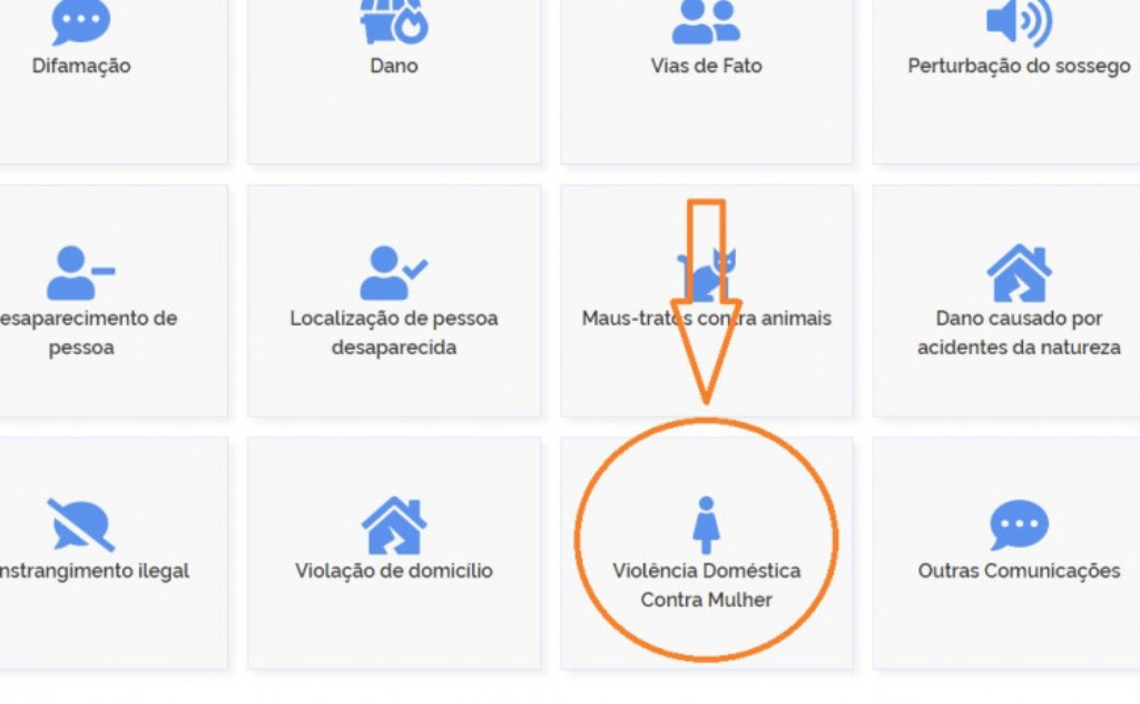 As vítimas podem acessar o site e clicar na opção “Tocantins”, ler as orientações prévias e a seguir clicar na opção ‘desejo prosseguir’. Um menu de opções de crimes será aberto, e próximo ao rodapé ela encontrará a opção que versa sobre violência doméstica conforme imagem abaixo