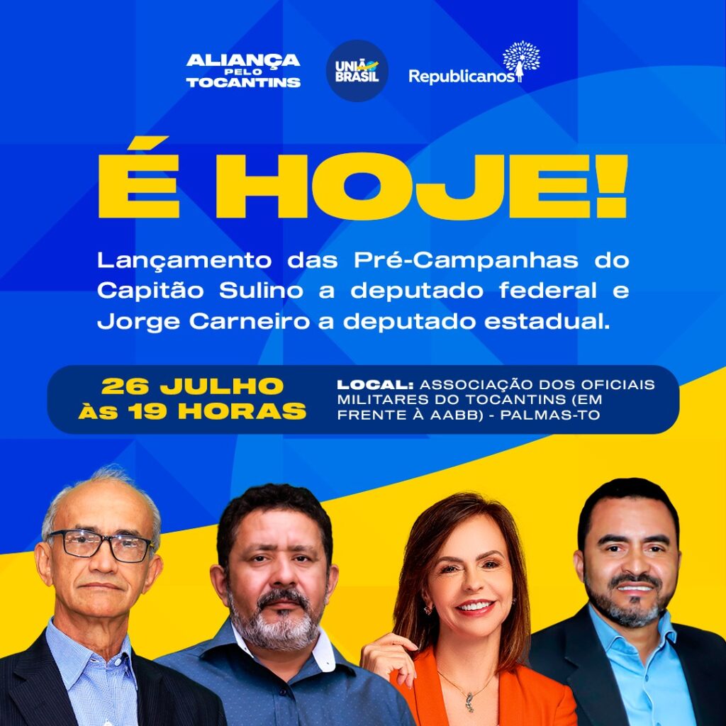 O pré-candidato a Deputado Federal pelo Tocantins, pelo partido União Brasil, Capitão Sulino, realizará nesta terça-feira, 26, sua pré-candidatura em Palmas. O evento acontecerá a partir das 19h, na  Associação dos Oficiais Militares do Tocantins, e contará com a presença do pré-candidato ao Governo, Wanderlei Barbosa, da pré-candidata ao Senado, Professora Dorinha, e do pré-candidato a Deputado Estadual, Sargento Jorge Carneiro.