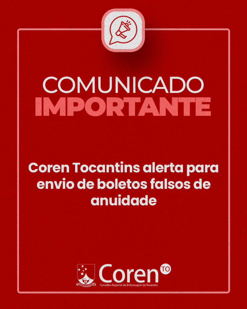 O Conselho Regional de Enfermagem do Tocantins (Coren-TO) alerta os profissionais de enfermagem para o envio falso de boletos, com uma suposta cobrança de anuidade.