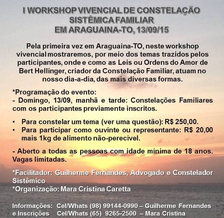 Em um workshop vivencial de constelações familiares são trabalhadas questões pessoais trazidas pelos integrantes do grupo. Integrantes estes que poderão levar uma questão a ser constelada ou não. Por isso, é possível participar como ouvinte atuando como representante e assistindo aos trabalhos, sem a obrigatoriedade de constelar.