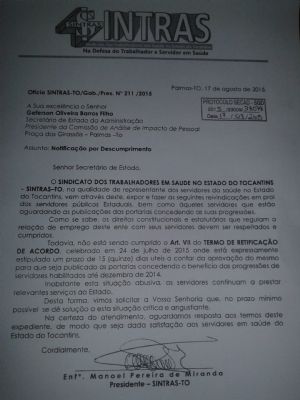 20150818_101525Foi protocolado nesta segunda-feira, 17, ao secretário de administração do Estado, Geferson Oliveira Barros Filho, o expediente notificando o Estado por descumprir termo do acordo referente às publicações das portarias de concessão das progressões.