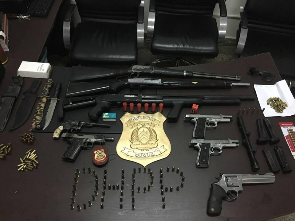 O arsenal é composto por três pistolas, duas de 40 e uma de 380, 2 revólveres, escopeta calibre 12, espingardas e bastante munições e facas.
