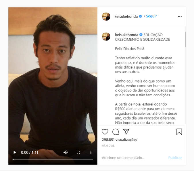 O meio campista japonês Honda, do Botafogo, anunciou que irá doar R$ 500 reais por dia para brasileiros – a cada dia, será para uma pessoa diferente. A intenção do atleta é ajudar pessoas que foram afetadas pela crise financeira originada durante a pandemia de covid-19.