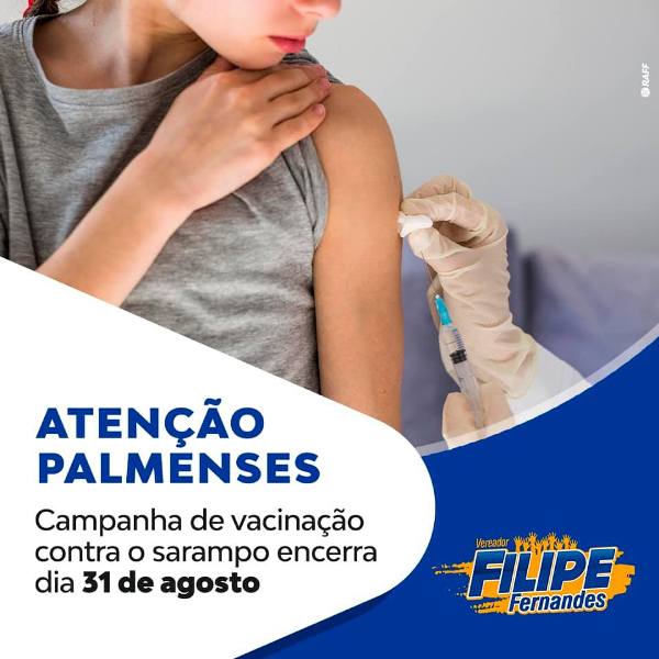 Em um post em suas redes sociais, ‘Atenção Palmenses – Campanha de vacinação contra o sarampo encerra dia 31 de agosto’, o parlamentar chama atenção da população. O vereador informa que nesta etapa, a campanha acontece de forma indiscriminada, para faixa etária de 20 a 49 anos, independentemente da situação vacinal, ou seja, todas as pessoas precisam tomar uma dose.