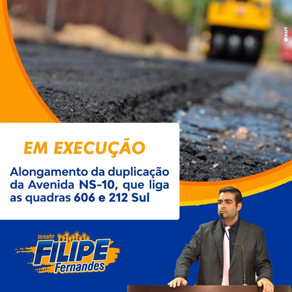 O alongamento da duplicação da Avenida NS-10, que liga as quadras 606 e 212 Sul, em Palmas, já se encontra em execução. A obra é um pedido do vereador Filipe Fernandes (PSDC), através do requerimento 021/2019, que está sendo atendido pelo executivo municipal. A iniciativa rendeu elogios por parte dos moradores daquela região.
