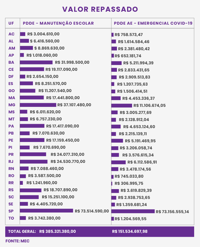 Além do programa emergencial, outros R$ 385 milhões foram repassados aos estados este ano para a manutenção escolar por meio do PDDE Básico. Os valores são diretamente proporcionais ao número de estudantes da educação básica pública, por isso, o estado de São Paulo teve o maior repasse, apresentando a maior quantidade de estudantes recenseados no ano de 2020.