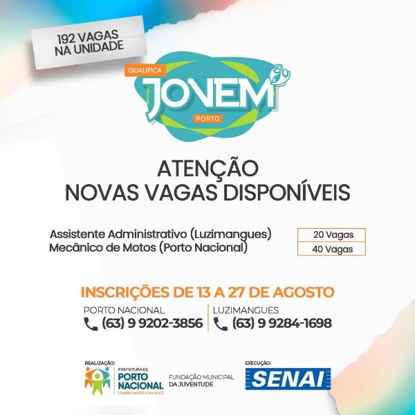 A cidade de Porto Nacional terá vagas para as áreas de Informática básica, fabricação de tortas doces, montagem e fabricação de pizzas, e classificação de grãos, sendo 20 vagas para cada turma, com exceção dos cursos de mecânico de motos, 40 vagas, e operador de computador, 16 vagas. Para o distrito de Luzimangues as vagas são de Assistente Administrativo, 20 vagas, e operador de computador, 36 vagas.
