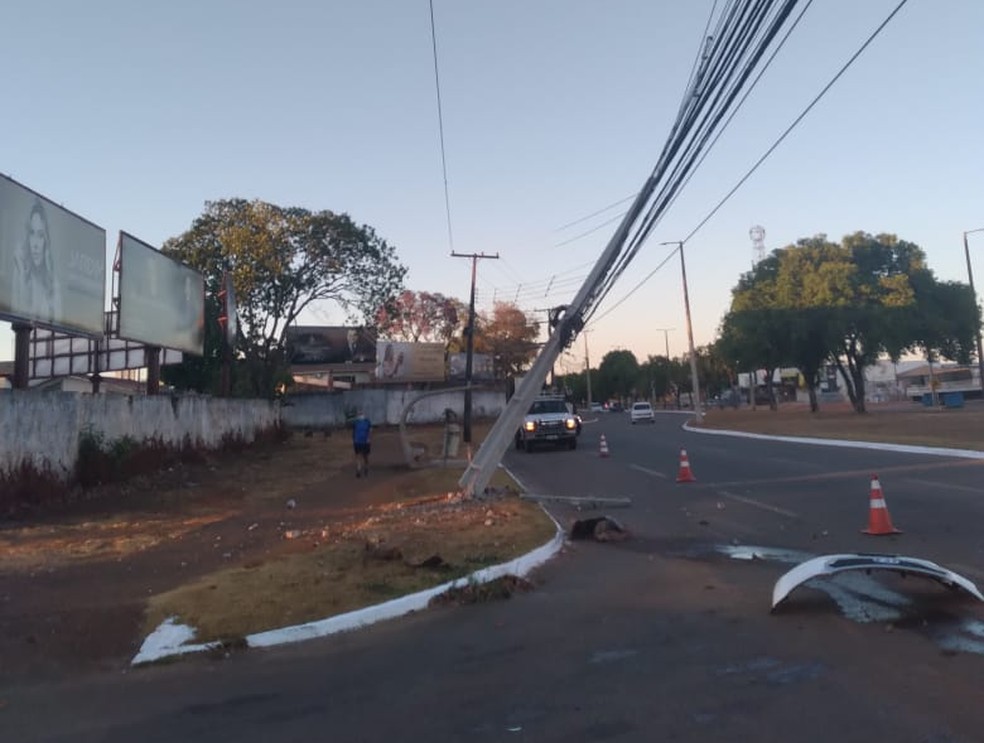 O trânsito ficou lento na Avenida NS-02, entre as quadras ACSU-SE 20 (202 Sul) e a Arse 21 (204 Sul), depois que um poste foi atingido por um carro na manhã desta quinta-feira (19) na região central de Palmas. O poste ficou pendurado pelos cabos. Ainda não há informação se o ocupante do veículo ficou ferido.
