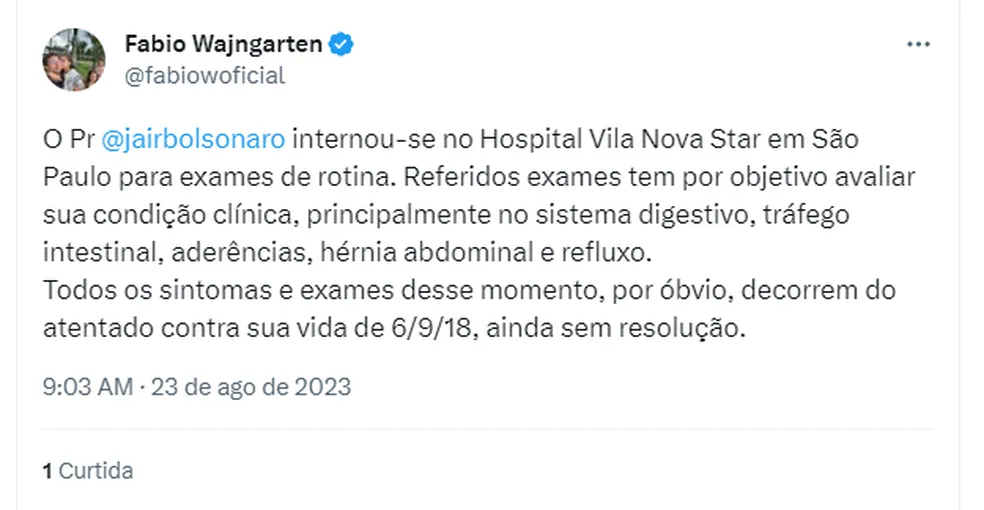 O ex-presidente Jair Bolsonaro (PL) foi internado na manhã desta quarta-feira (23) em São Paulo para realizar exames de rotina, segundo o advogado Fábio Wajgarten.
