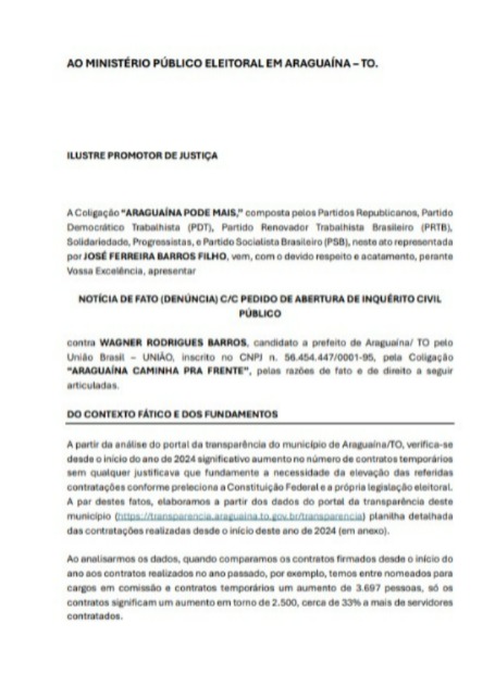 A denúncia feita ao Ministério Público Eleitoral (MPE) do Tocantins pela Coligação Araguaína Pode Mais, nesse domingo, 18, apontou que, mesmo sem criação de secretarias, serviços e ações relevantes desde janeiro de 2024, o prefeito Wagner Rodrigues (União Brasil), candidato à reeleição, aumentou cerca de 3 mil pessoas à folha de pagamento da Prefeitura de Araguaína. Só os contratos, segundo o documento, significam um aumento em torno de 2.500, cerca de 33% a mais de servidores contratados em seis meses do ano eleitoral, caracterizando abuso de poder político.