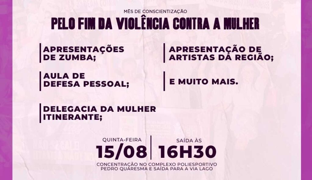 A caminhada acontecerá nesta quinta-feira, 15, com início programado às 16h30. A concentração ocorrerá no Complexo Poliesportivo Pedro Quaresma e seguirá até a Via Lago. A ação é realizada em alusão ao Agosto Lilás, mês de conscientização pelo fim da violência contra as mulheres e em celebração ao aniversário da Lei Maria da Penha, que completou 18 anos este mês.
