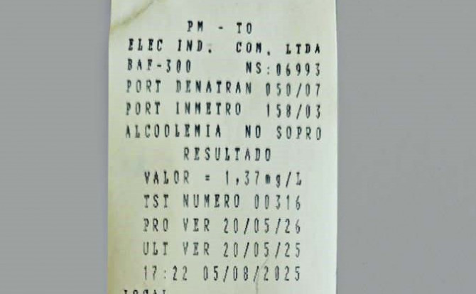 Na abordagem, chamou a atenção dos agentes de trânsito a quantidade de álcool identificada no organismo do condutor. Ao realizarem o teste do bafômetro, foi detectado 1,37 mg/L de álcool no corpo do indivíduo, 1,03 mg/L acima da quantidade considerada para o crime de embriaguez, que é de 0,34 mg/L.