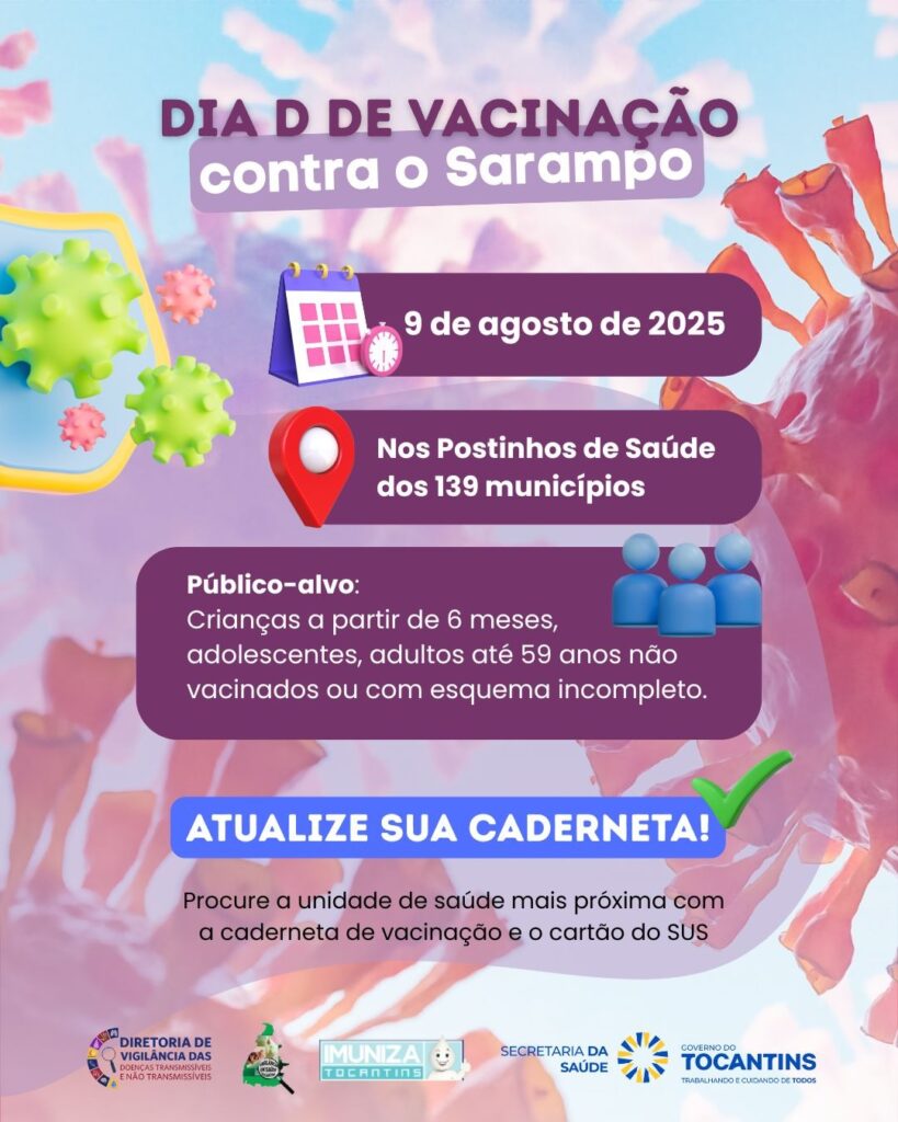 O Tribunal de Contas do Estado do Tocantins (TCETO), ciente da importância das ações de prevenção e controle de doenças imunopreveníveis, manifesta apoio total à campanha estadual de vacinação contra o SARAMPO, promovida pela Secretaria de Estado da Saúde (SES/TO). Diante do aumento dos casos da doença no Tocantins, reforçamos a necessidade de mobilização de todos os gestores municipais, especialmente das Secretarias Municipais de Saúde, para adesão ao Dia “D” de Vacinação, que será realizado no próximo dia 9 de agosto de 2025, em todo o estado.
