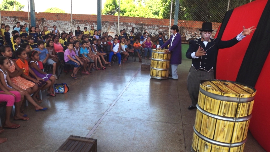 Alunos da escola Simão Lutz, em Araguaína, tiveram uma manhã diferente nesta segunda-feira, 16, com a apresentação do espetáculo “Dois idiotas sentados, cada qual no seu barril” com os atores Juliano Gomes e Nival Correia. A peça é uma adaptação da obra da escritora Ruth Rocha e traz a temática do combate à violência.