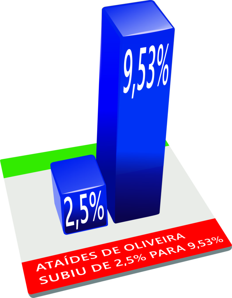 Neste ritmo, Ataídes Oliveira mostra-se o candidato que mais sobe nas pesquisas, com um crescimento de aproximadamente 200%. Some-se a isso o fato de que o representante da coligação “Reage Tocantins” tem apenas 6,06% de rejeição, enquanto os outros concorrentes, Marcelo Miranda (PMDB) e Sandoval Cardoso (SD), aparecem com 14,72% e 18,11%, respectivamente.