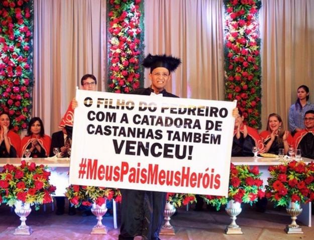 Filho de pedreiro e de catadora de castanhas, o estudante de direito Ismael do Nascimento Silva, 25, emocionou quem estava presente na colação de grau dele ocorrida em Teresina (PI), na noite da última sexta-feira (11). O jovem subiu no tablado da área de entrega do diploma carregando um banner destacando a origem humilde da família. “O filho do pedreiro com a catadora de castanhas também venceu”, dizia a faixa com a hastag #MeusPaisMeusHeróis.