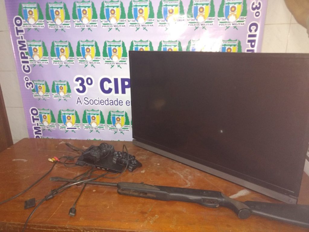 Os policiais militares empreenderam diligências para averiguar a situação em um indivíduo estaria vendendo objetos de procedência duvidosa. O autor, que portava uma espingarda, foi localizado e ainda identificou os compradores de um aparelho de TV e um videogame, que também foram detidos no setor Recanto.