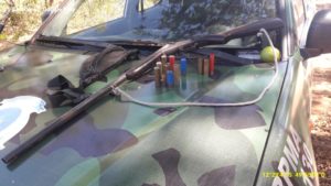 Com os procedimentos padrões de vistoria no interior do veículo foi localizada uma espingarda calibre 16 com 2 cartuchos deflagrados do mesmo calibre, além de mais um cartucho deflagrado de 28.