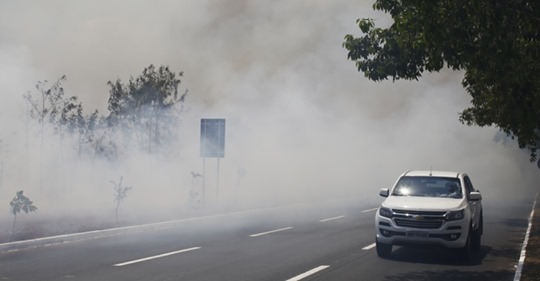 Imagens feitas por moradores e compartilhadas nas redes sociais mostram que o trânsito ficou prejudicado pela fumaça na Avenida JK e na NS-3. As chamas também se aproximaram da Área de Preservação do Córrego Brejo Comprido.