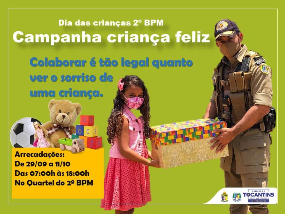 Policiais militares do 2º BPM iniciam nesta terça-feira, 29, a Campanha Criança Feliz: Colaborar é tão legal quanto ver o sorriso de uma criança. A ação de arrecadação de brinquedos culminará na entrega dos presentes para as crianças do Setor Costa Esmeralda em Araguaína, no próximo dia 12 de outubro. A PM visa mobilizar toda a corporação e a sociedade para a arrecadação.