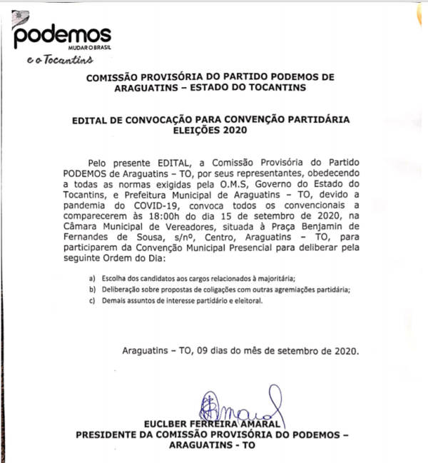 O Presidente municipal do Podemos,  Eucleber Ferreira  Amaral, do município de Araguatins/Tocantins, obedecendo a todas as normas exigidas pela O.M.S, Governo do Estado, e Prefeitura Municipal , devido  a pandemia do Covid-19, convoca os convencionais a comparecerem às 18hs no dia 15 de setembro de 2020, na Câmara Municipal de vereadores, situada à Praça Benjamin de Fernandes de Souza, S/N, Centro, para deliberar, com a presença da maioria de seus membros com direito a voto, sobre as eleições majoritária e proporcional de 2020.
