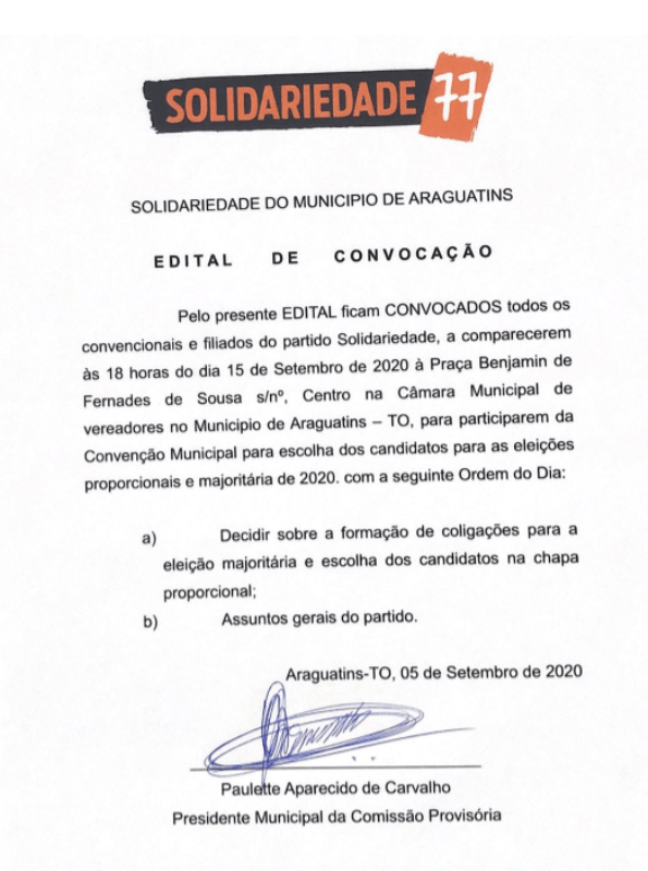 A Presidente municipal do Partido Solidariedade – SD, Paulette Aparecido de Carvalho, do município de Araguatins/Tocantins, considerando a legislação eleitoral vigente e, em atenção a decisão do comitê municipal de Araguatins, convoca os convencionais e demais filiados, para participarem da Convenção Municipal a ser realizada no dia 15 de setembro de 2020, com início às 18:00 horas, na Praça Benjamim de Fernandes de Sousa s/n, centro, Câmara Municipal de Araguatins, para deliberar, com a presença da maioria de seus membros com direito a voto, sobre as eleições majoritária e proporcional de 2020.