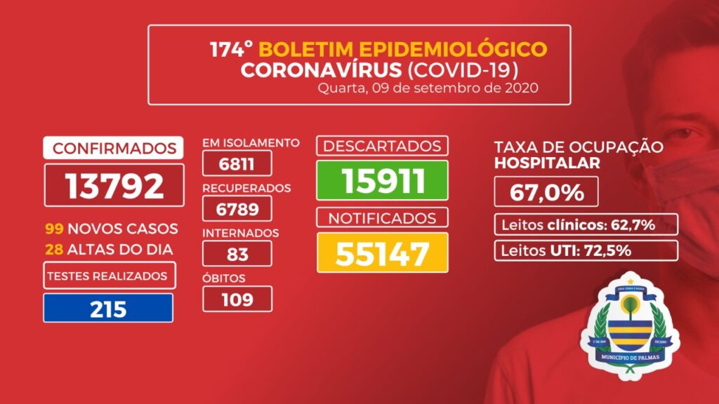 Após realizar 265 testes na terça-feira, 08, Palmas registra 99 novos casos de Covid-19 no Boletim Epidemiológico nº 174 desta quarta-feira, 09 de setembro. Do total de contaminados, 44 são mulheres e 55 são homens. Dos novos casos, apenas uma pessoa está hospitalizada, e os demais encontram-se em isolamento domiciliar.