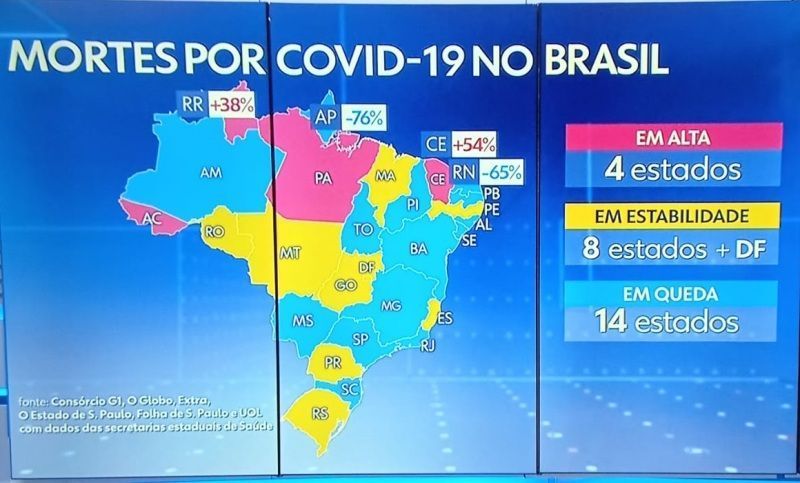 No total, 4 estados apresentaram alta de mortes: AC, PA, RR e CE. O estado do Piauí não publicou atualizações até as 20h.
