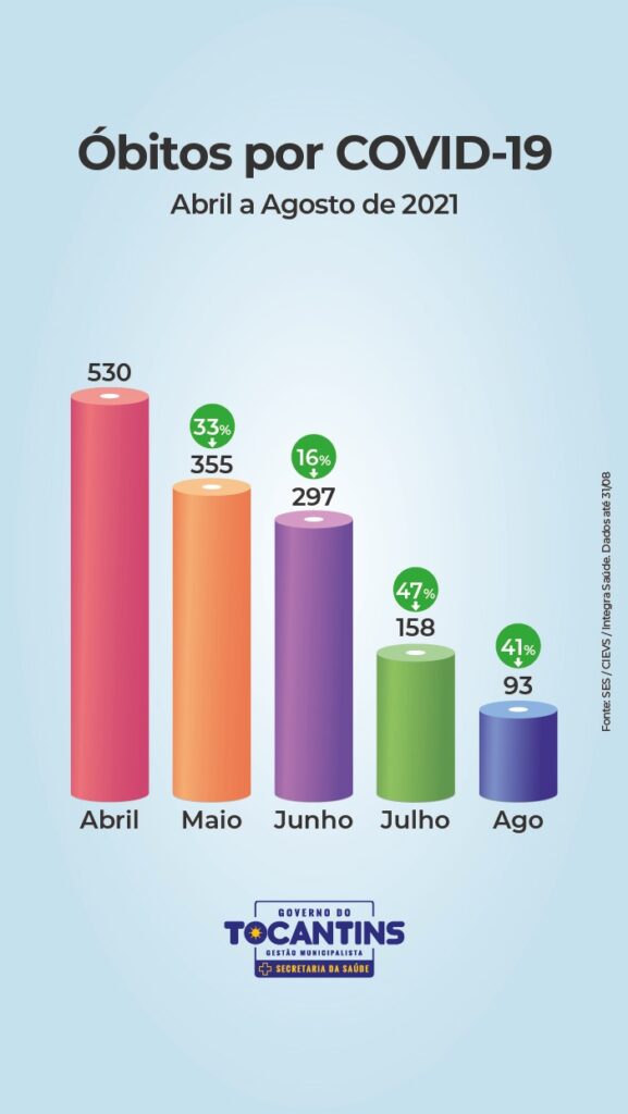 A título exemplificativo, em julho de 2021, foram registrados no Tocantins, 11.251 novos casos da Covid-19, 158 óbitos pela doença e 300 internações em UTI. Já em agosto, o Estado contabilizou 7.687 casos, 93 óbitos e 164 internações para cuidados intensivos. Uma redução de 32%, 41% e 45% respectivamente.