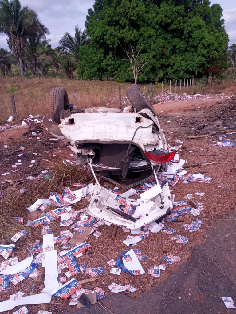 O carro, que ficou destruído, é um voyage, 2022/2023, com placas de São Paulo. Imagens mostram que as vítimas estariam a serviço de candidatos. Santinhos e adesivos ficaram espalhados às margens da via.