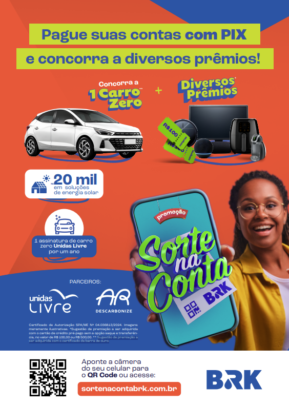 A BRK, uma das principais empresas de saneamento privado do Brasil, lança, nesse mês, a segunda edição da campanha ‘Sorte na Conta’ que premiará os consumidores que optarem pelo pagamento das faturas de água via PIX.