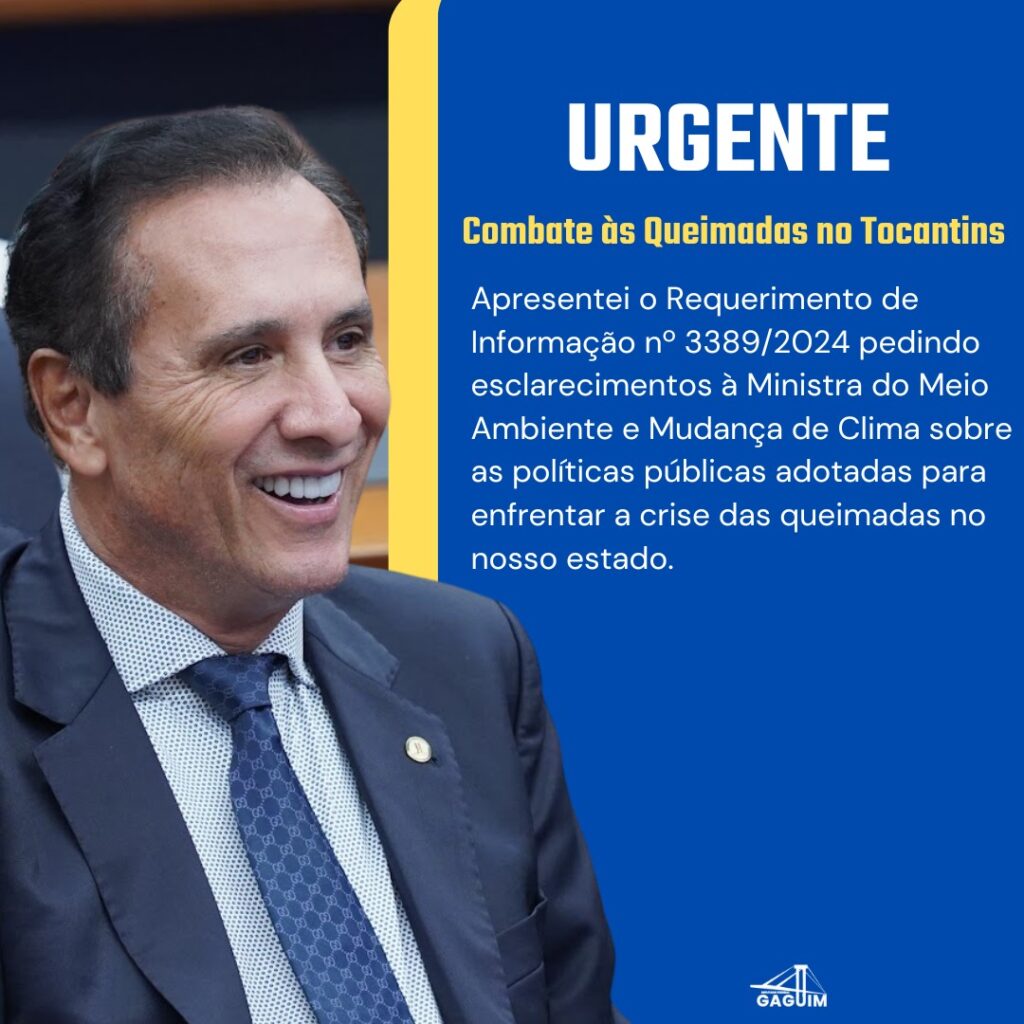No requerimento, Gaguim questiona a Ministra sobre as políticas públicas em curso e o que está sendo feito para conter a crise ambiental no estado. Ele argumenta que, diante do aumento expressivo dos focos de incêndio e da gravidade da situação, é imprescindível que a população tocantinense tenha conhecimento sobre as ações efetivas adotadas pelo governo federal para mitigar os impactos das queimadas.