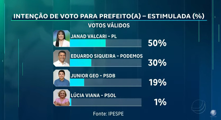 A candidata à prefeitura de Palmas, Janad Valcari (PL), alcançou 50% das intenções de votos válidos na mais recente pesquisa Ipespe/Fieto, divulgada pela TV Jovem Palmas/Record nesta quarta-feira, 11. O número coloca Janad tecnicamente próxima de uma vitória no primeiro turno e consolida sua posição de liderança com uma diferença de 20 pontos percentuais sobre o segundo colocado, Eduardo Siqueira Campos (Podemos), que caiu para 30%. Júnior Geo (PSDB) permanece estagnado em 19%, enquanto Lúcia Viana (PSOL) segue com 1%.