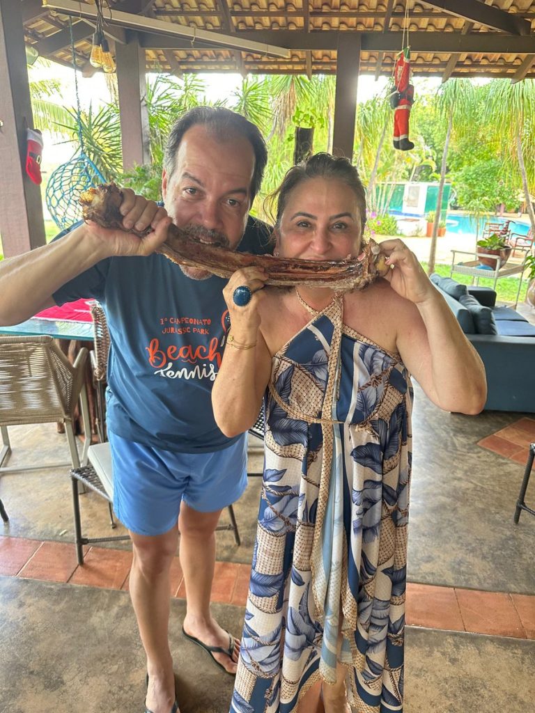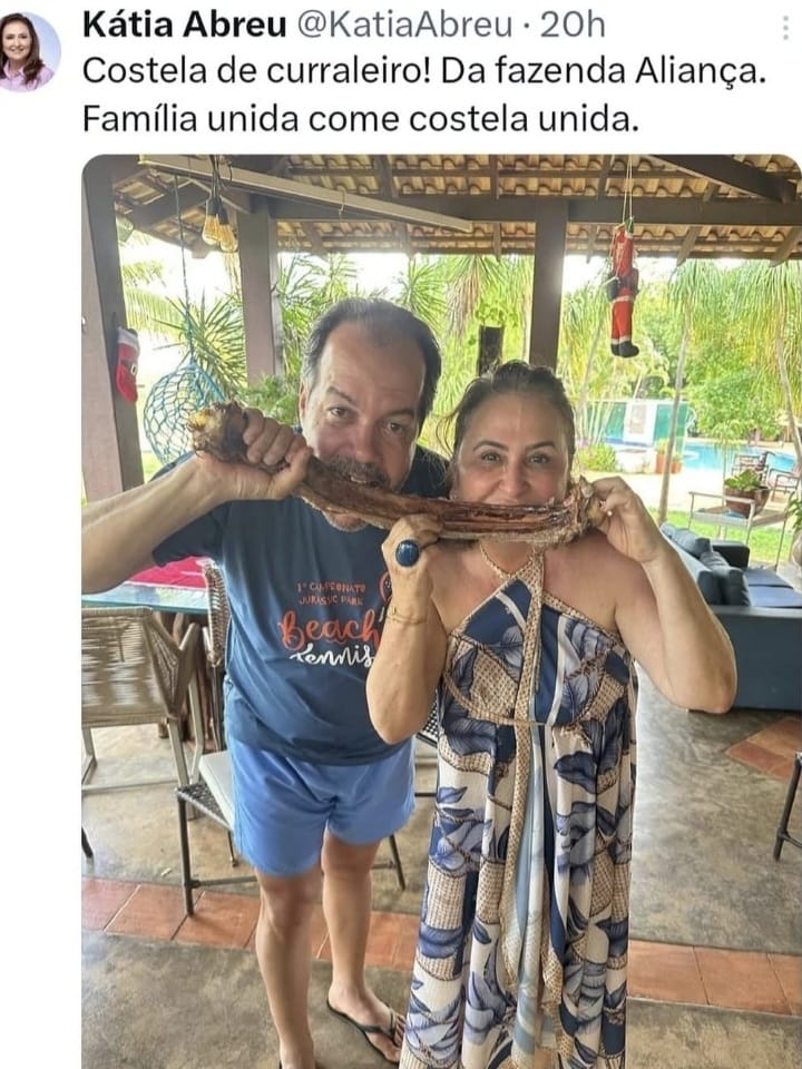 Voltou a circular em grupos de WhatsApp e redes sociais um print de novembro de 2024, no qual a ex-senadora Kátia Abreu aparece ao lado do marido, Moisés Gomes, segurando um osso de costela com a legenda: “Costela de curraleiro! Da fazenda Aliança. Família unida come costela unida.” A publicação é apontada como sátira ao governador Wanderlei Barbosa, que utilizou o mote “curraleiro” em sua campanha eleitoral.