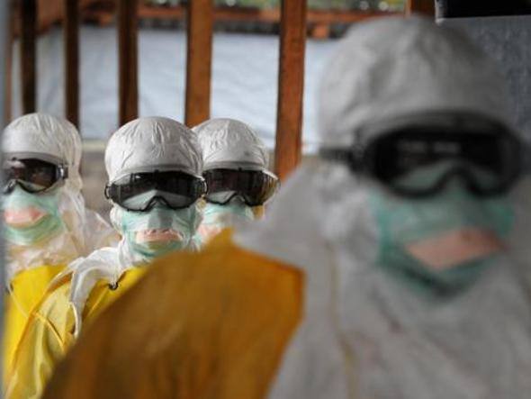 Funcionários da área da saúde usam roupas de proteção contra o ebola em hospital