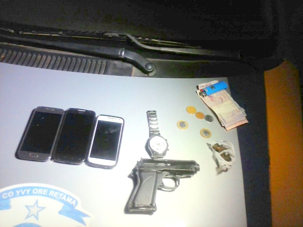 Com os indivíduos foram encontrados um simulacro de arma preta tipo pistola pequena, dois aparelhos celulares, um relógio de pulso e uma porção de maconha enrolada em uma sacolinha.