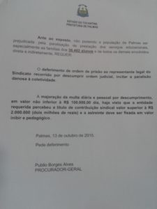 Apesar de o representante legal do sindicato ser José Roque Santiago, presidente estadual, Joelson Pereira, que preside a diretoria de Palmas da entidade, é quem pode ser detido, já que foi o responsável citado na decisão da desembargadora Jacqueline Adorno, que determinou a suspensão do movimento paredista. Conforme narra a petição do Paço, Santiago não estava em Palmas durante as visitas do oficial de Justiça.